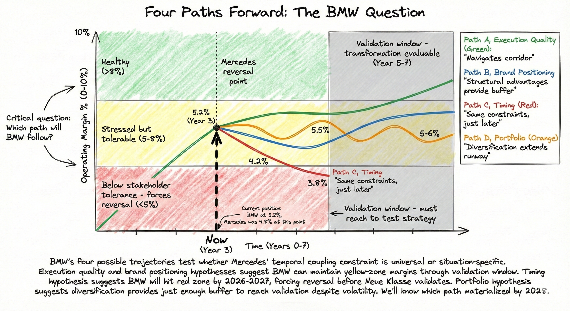 We’ll know by 2028. If BMW maintains margins above 5% through 2027-2028 while Neue Klasse investment is validated by observable market acceptance and sustainable unit economics, it proves that skilled execution, combined with structural advantages, can navigate temporal coupling. The strategic corridor is narrow but navigable. Every incumbent facing similar dynamics has reason for hope. Strategic transformation under uncertainty remains extraordinarily difficult but not impossible.