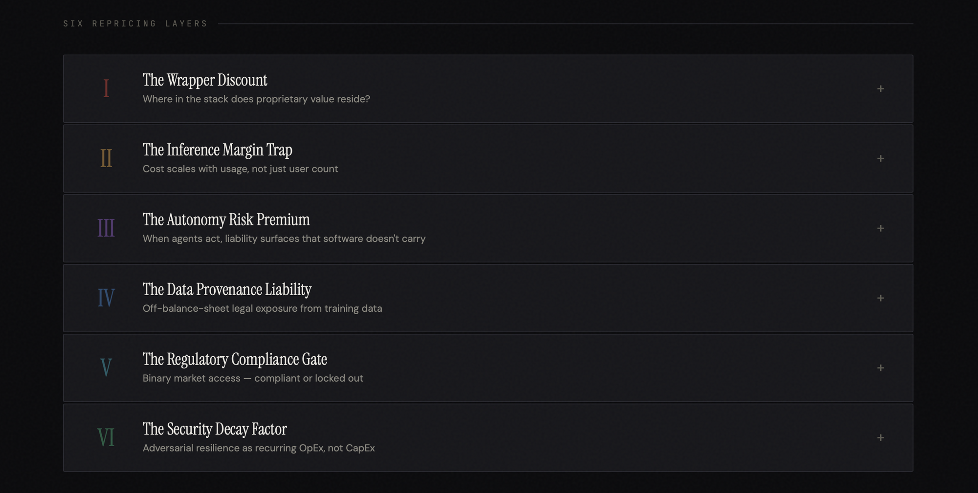 The wrapper discount, the inference margin trap, the autonomy risk premium, the data provenance liability, the regulatory compliance gate, and the security decay factor are not abstractions. They are repricing mechanisms, operating now, in every term sheet and deal committee where the question is no longer "Is this company using AI?" but "Is this company's AI worth what we're being asked to pay?"