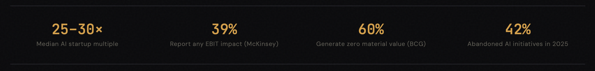 The numbers make the mispricing visible. AI startups command median revenue multiples of 25–30x, about four to five times those of public SaaS companies. Late-stage category-defining companies deliver 40–50x returns, with outliers exceeding 100x. These premiums are, in theory, justified by transformative potential. But the ground truth tells a different story. McKinsey's 2025 State of AI survey, covering about 2,000 organizations, found that while 88% now use AI in at least one function, only 39% report any impact on enterprise-wide EBIT, and most of those attribute less than 5% of EBIT to AI. BCG's research is blunter: 60% of companies generate no material value from their AI investments, and only 5% are creating substantial value at scale. Gartner predicts that over 40% of agentic AI projects will be cancelled by 2027, and the share of companies abandoning most AI initiatives jumped from 17% in 2024 to 42% in 2025. The question is not whether AI deserves a premium. The question is whether the current premium structure reflects the technical and economic realities that underpin it.