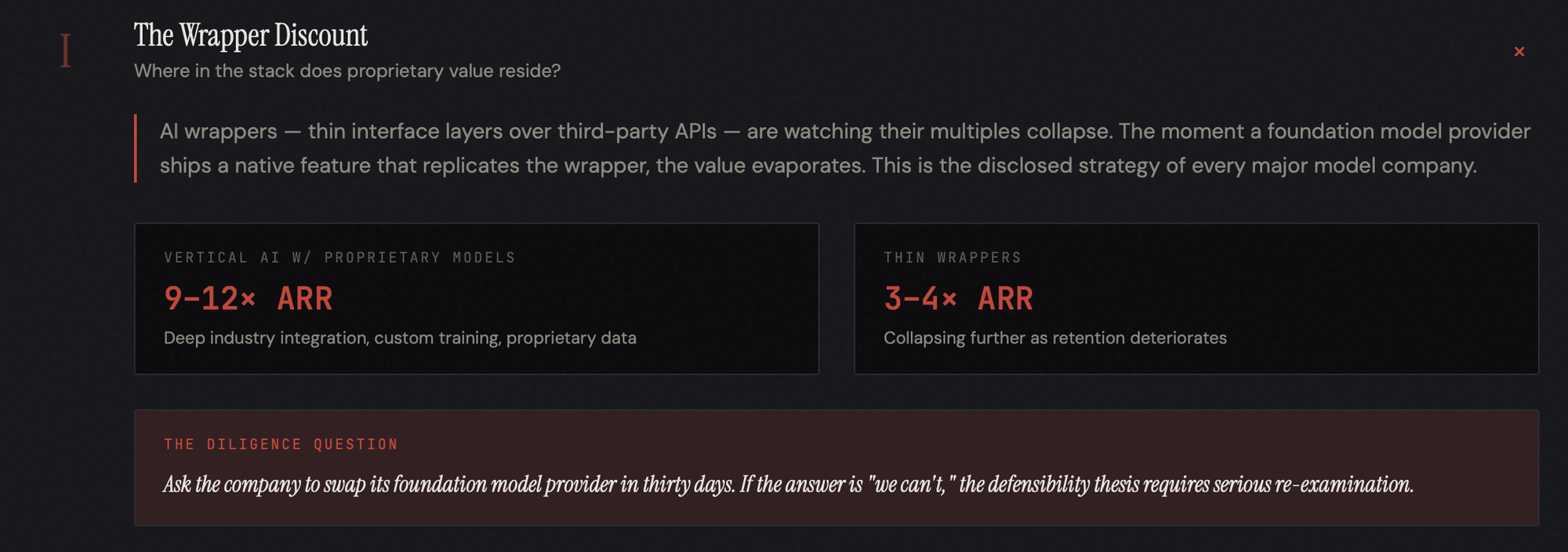 The due diligence question is precise: where in the stack does proprietary value reside, and what is the switching cost if the model layer changes? Companies with proprietary RAG pipelines, custom fine-tuned models on unique datasets, or novel architectures that create performance advantages independent of any single provider can defend their position. Companies whose primary asset is a prompt template cannot. The valuation gap, currently a spread of about 3x to 5x in revenue multiple terms, is, if anything, too narrow.