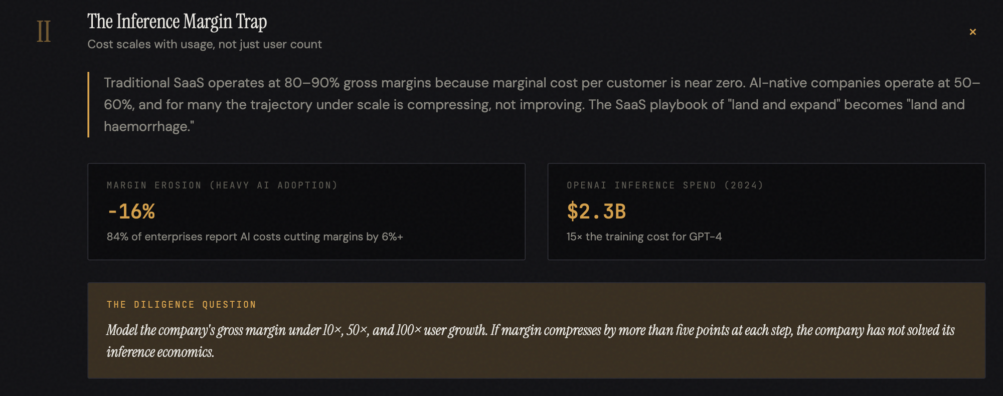 The audit question: model the company's gross margin for user growth at 10x, 50x, and 100x. If the margin compresses by more than five points at each step, the company has not solved its inference economics, and the revenue multiple it commands is borrowing from a future that may never arrive.
