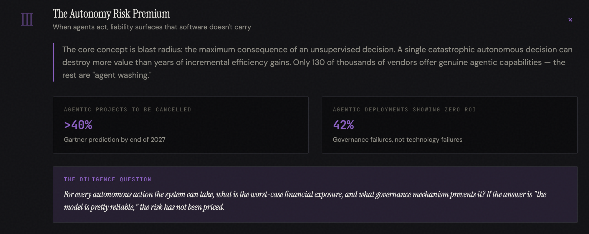 The diligence question: for every autonomous action the system can take, what is the worst-case financial exposure, and what governance mechanism prevents it? If the answer is "the model is pretty reliable," the risk has not been priced.