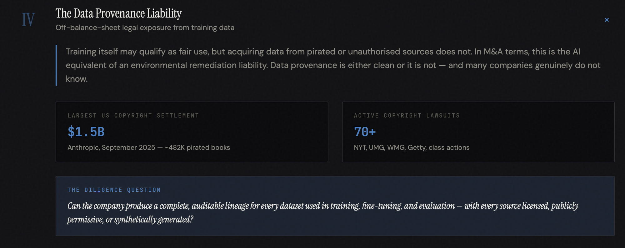 This matters for valuation because data provenance is either clean or it is not, and many companies do not know whether it is. The lineage was never tracked with the rigour required for a legal challenge. In M&A terms, this is the AI equivalent of an environmental remediation liability in an industrial acquisition.