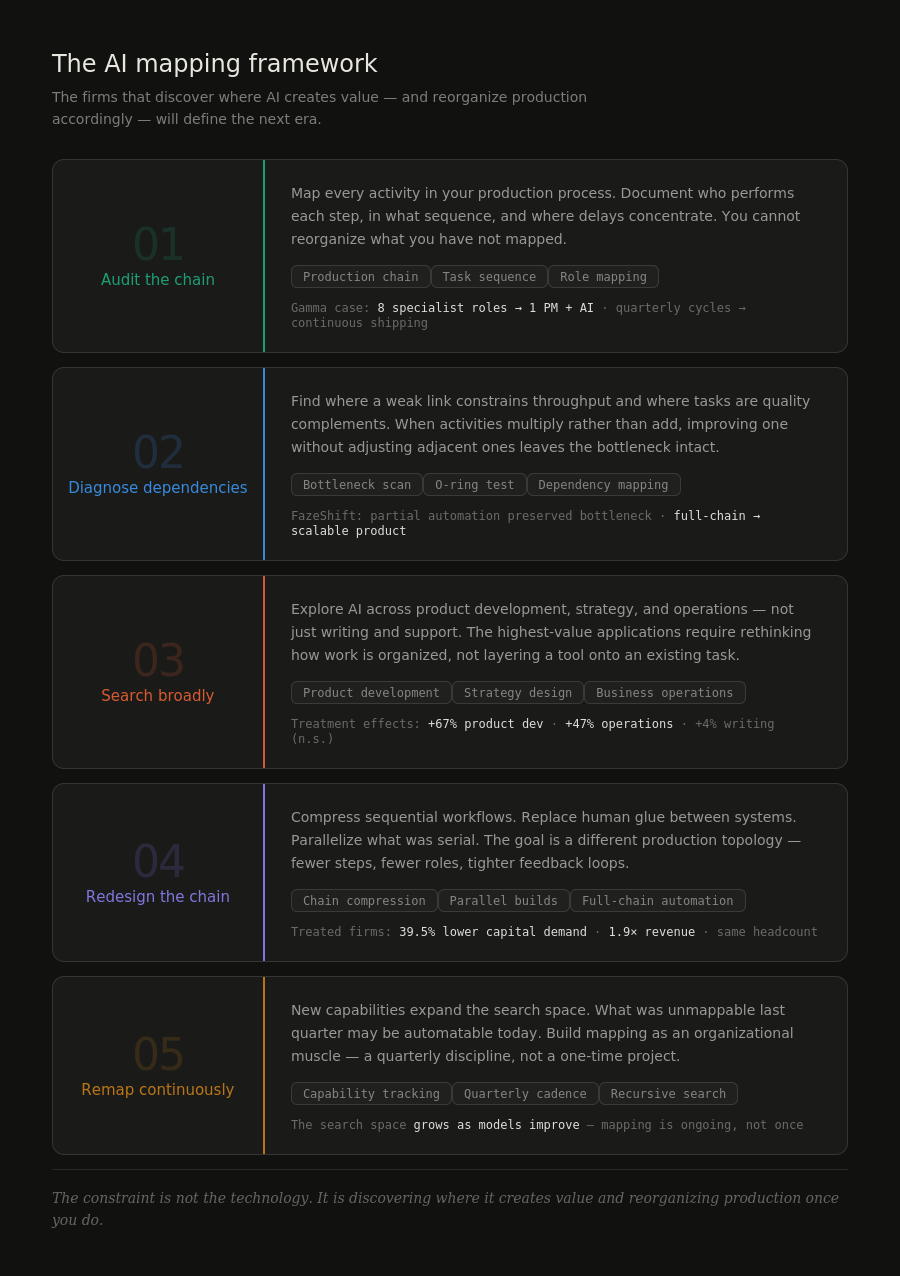 The treated firms didn't just learn to use AI tools. They learned to see their production processes as chains of interconnected activities and to ask: where in this chain does AI create the most leverage, and what else has to change to make that leverage real?