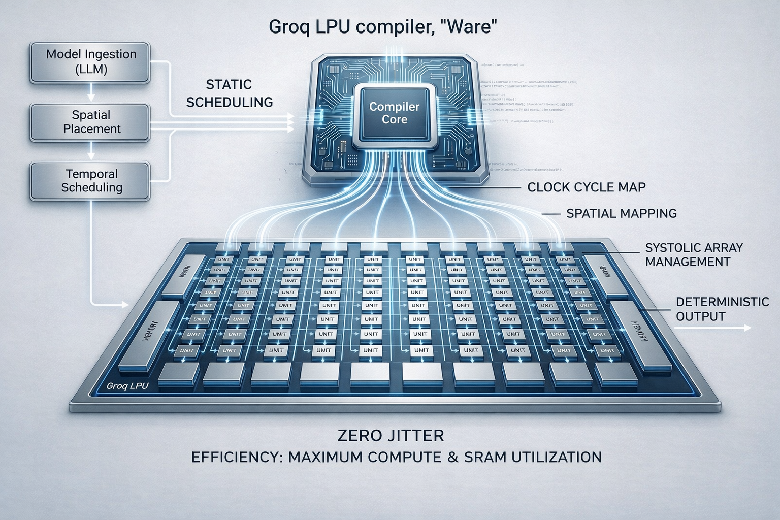 Groq completely discards this paradigm. Instead, its architecture includes a compiler that statically schedules every instruction, every memory access, and every data dependency at compile time. Also, there is no hardware scheduler, no speculative execution, and no cache hierarchy guessing where data might be needed next. Every execution cycle is planned in advance, like a perfectly orchestrated pipeline. Consequently, this novel design ensures that execution time is fully predictable, that latency variance collapses, that resource utilization becomes new-optimal, and that debugging and optimization shift from runtime heuristics to compile-time reasoning.