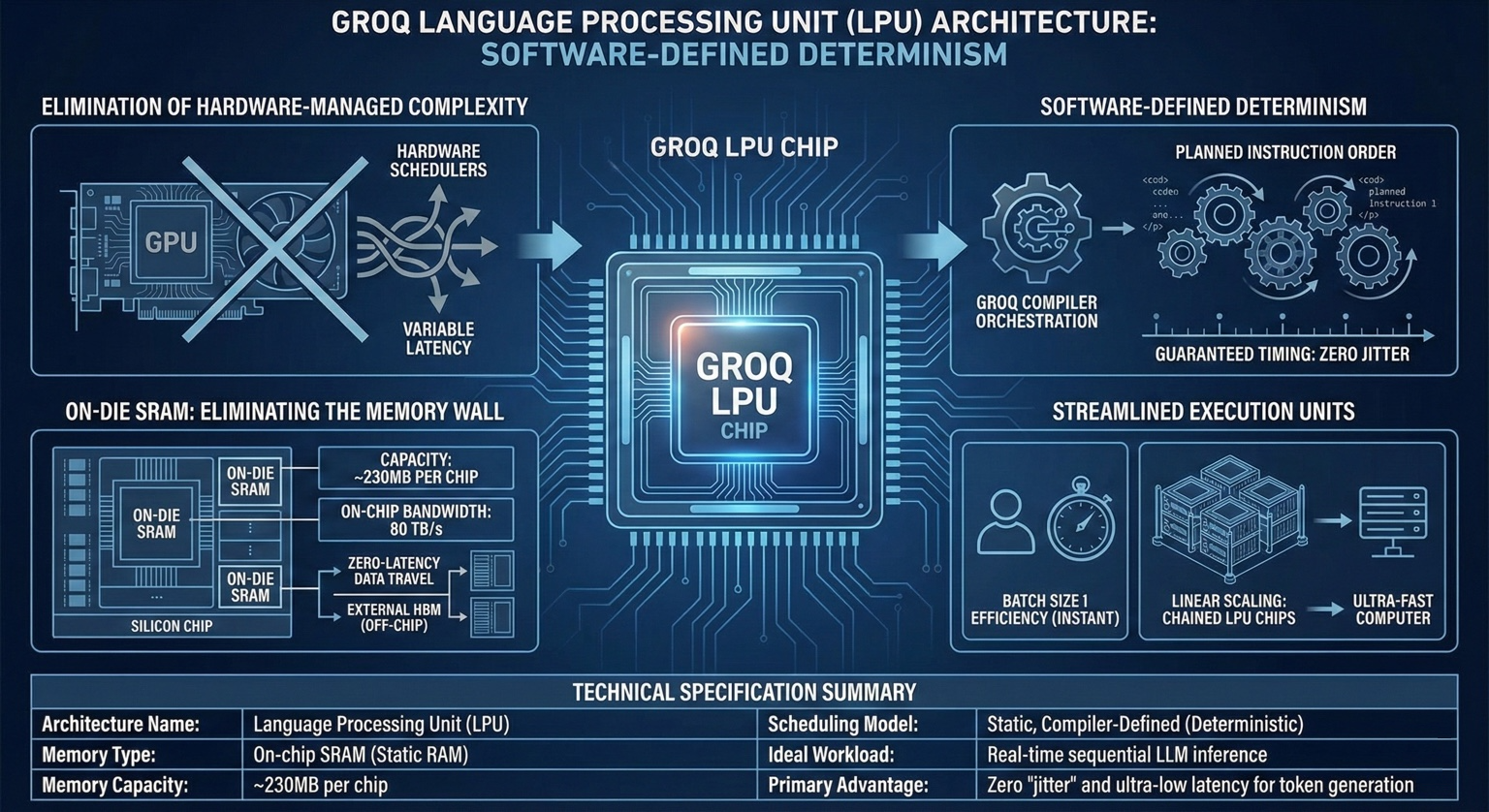 Groq recognized that inference is not a throughput problem; rather, it is a coordination problem, driven by latency, determinism, and data movement. With this realization, the company rejected the core architectural principles of GPUs and built a novel architecture from the ground up. The central innovation of Groq’s LPUs is its consideration of deterministic execution as a first-class design constraint. As discussed earlier, in conventional GPU architecture, computation is dynamically scheduled – instructions are issued based on runtime availability of data, cache state, and warp readiness. This dynamism maximizes average throughput but introduces unavoidable variability in the form of latency spikes, cache misses, and pipeline bubbles – that become increasingly problematic as workloads shift from batch to interactive.